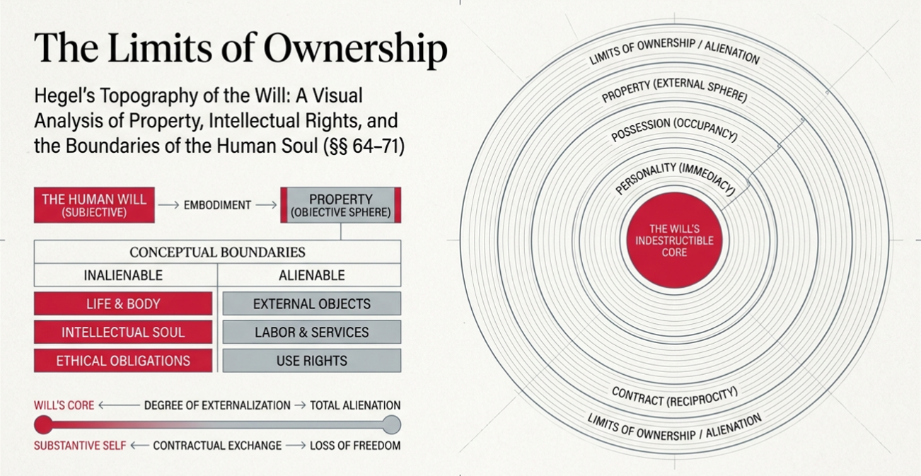 > 헤겔에게서 자유로운 계약은 오직 제한된 시간과 제한된 노동력의 사용을 양도하는 경우에만 가능하며, 삶의 시간 전체와 생산 전체를 양도하는 것은 곧 인격 자체를 타인의 재산으로 만드는 것이므로 노예제와 다르지 않다.